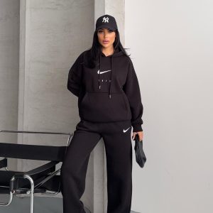 Gornji dio trenerke dolazi u prepoznatljivom oversize kroju, koji je danas jedan od najpopularnijih modnih trendova jer nudi savršenu ravnotežu između opuštenog i modernog izgleda. Kapuljača, čvrste vezice i kvalitetan Nike print doprinose sportsko–urbanom stilu, dok široke nogavice na donjem dijelu dodatno naglašavaju udobnost i eleganciju. Ovaj model posebno je omiljen među ženama koje vole praktičnost, ali ne žele da žrtvuju stil.